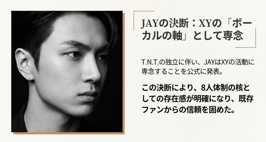 公式には、独立するT.N.T.にJAYは今後参加せず、XY Dance Vocalの活動に専念すると案内されています。これは、XYとしての活動の核が「8人」に定まり、その中心にJAYがいることを裏付ける重要な情報です。